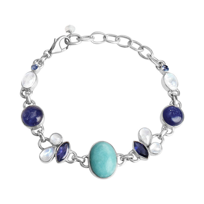 Our bracelet features a gorgeous Larimar centerpiece with shimmering rainbow moonstone and sparkling Iolite in a unique sterling silver setting.
