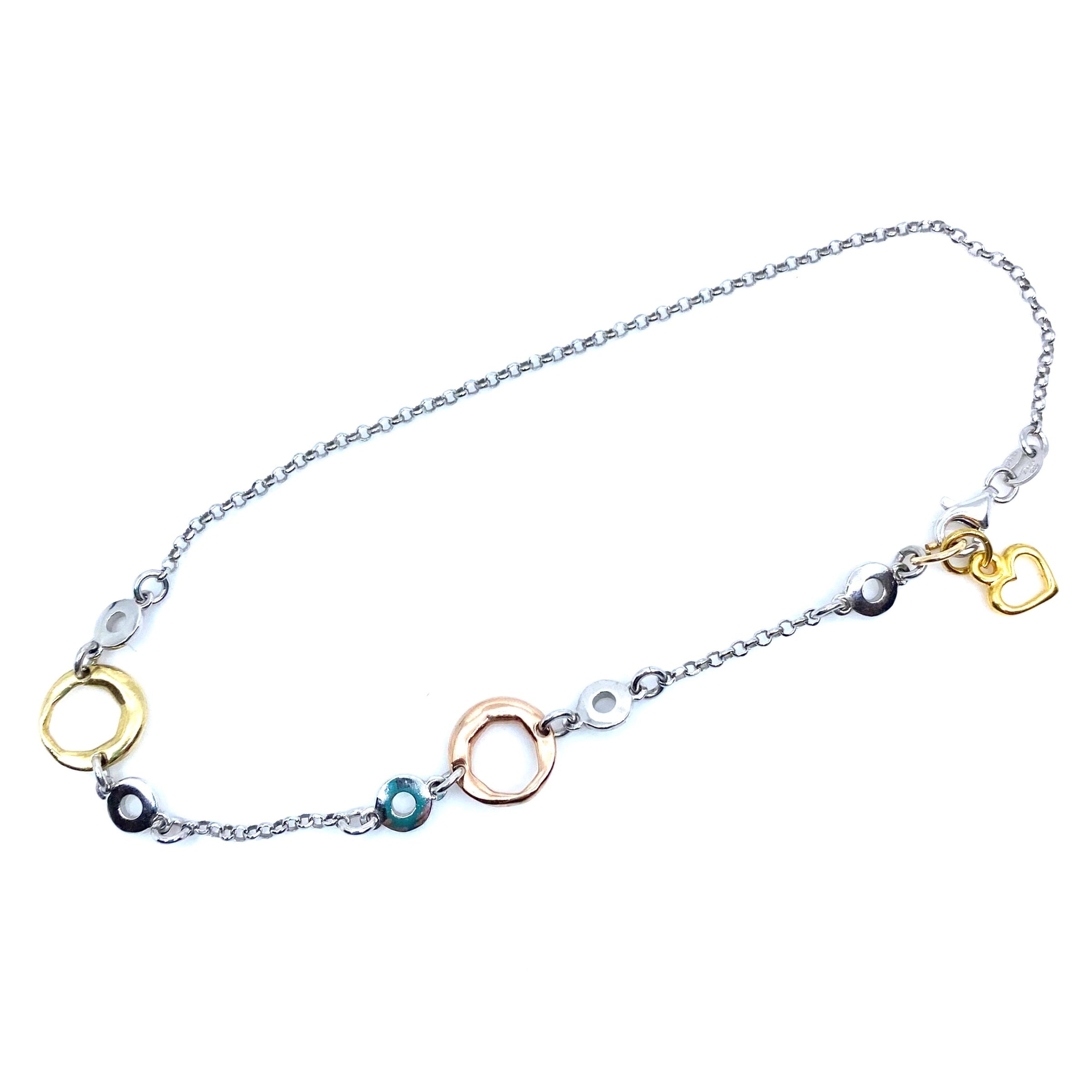 Italian Tri-Color Rhodium Plated Sterling Silver and Gold Heart Anklet
