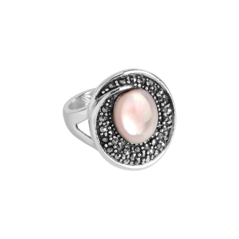 Shimmering Pink Mother of Pearl and Marcasite Sterling Silver Statement Ring