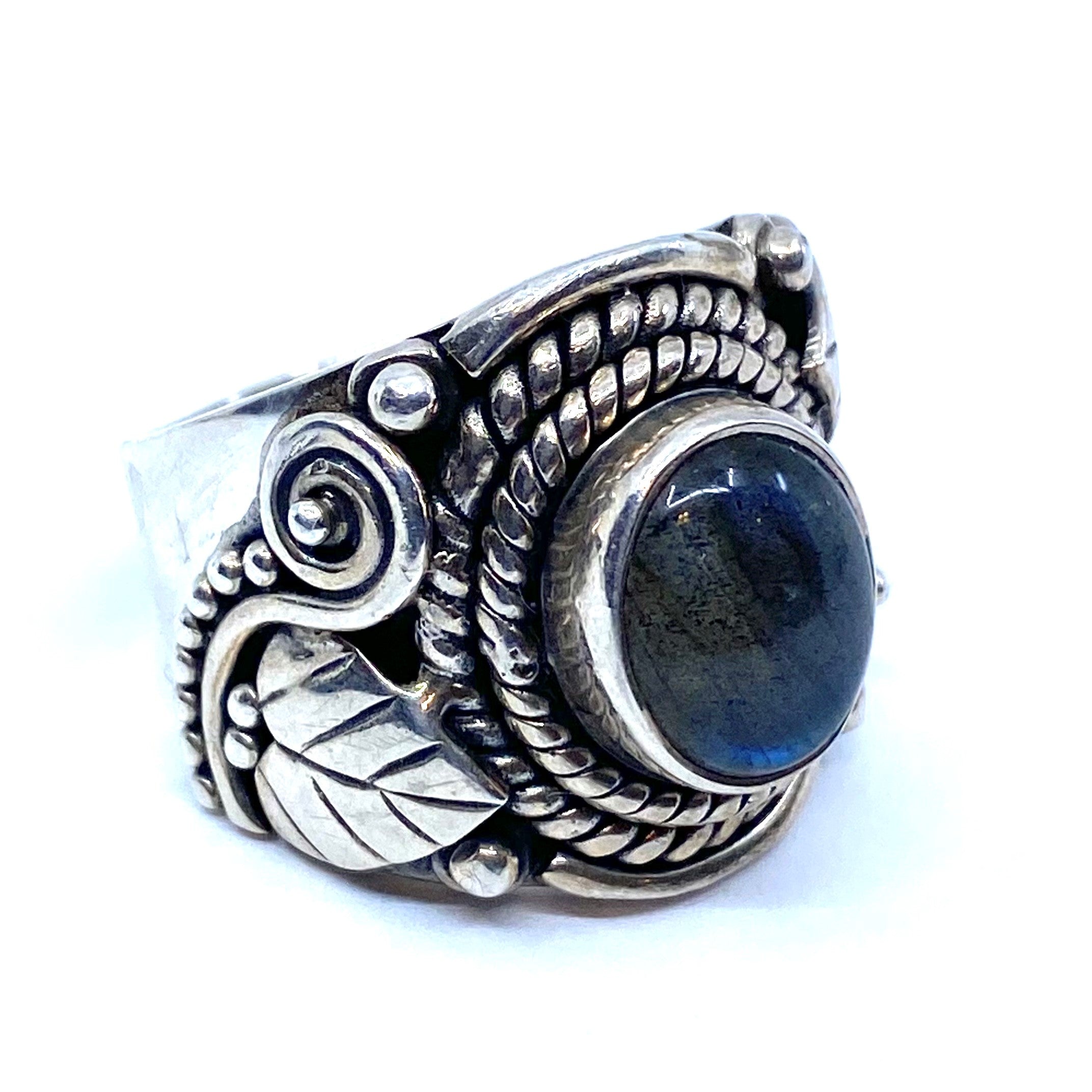 Gorgeous blue labradorite set with rope & swirls & leaves detailing.