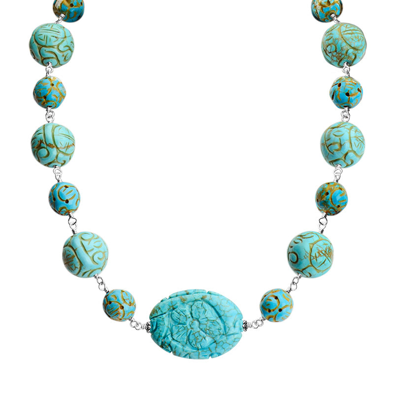 Beautiful blue carved chalk turquoise necklace with sterling silver clasp.