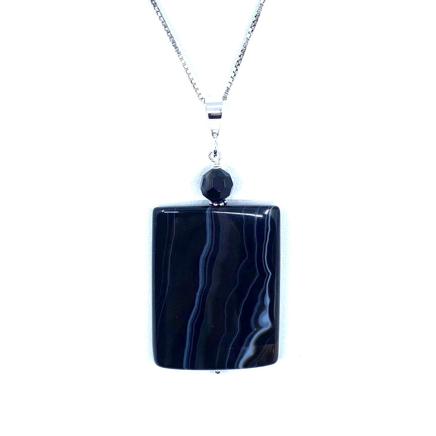 Natural Banded Black Onyx Large Stone with White Wavey Lines Statement Pendant