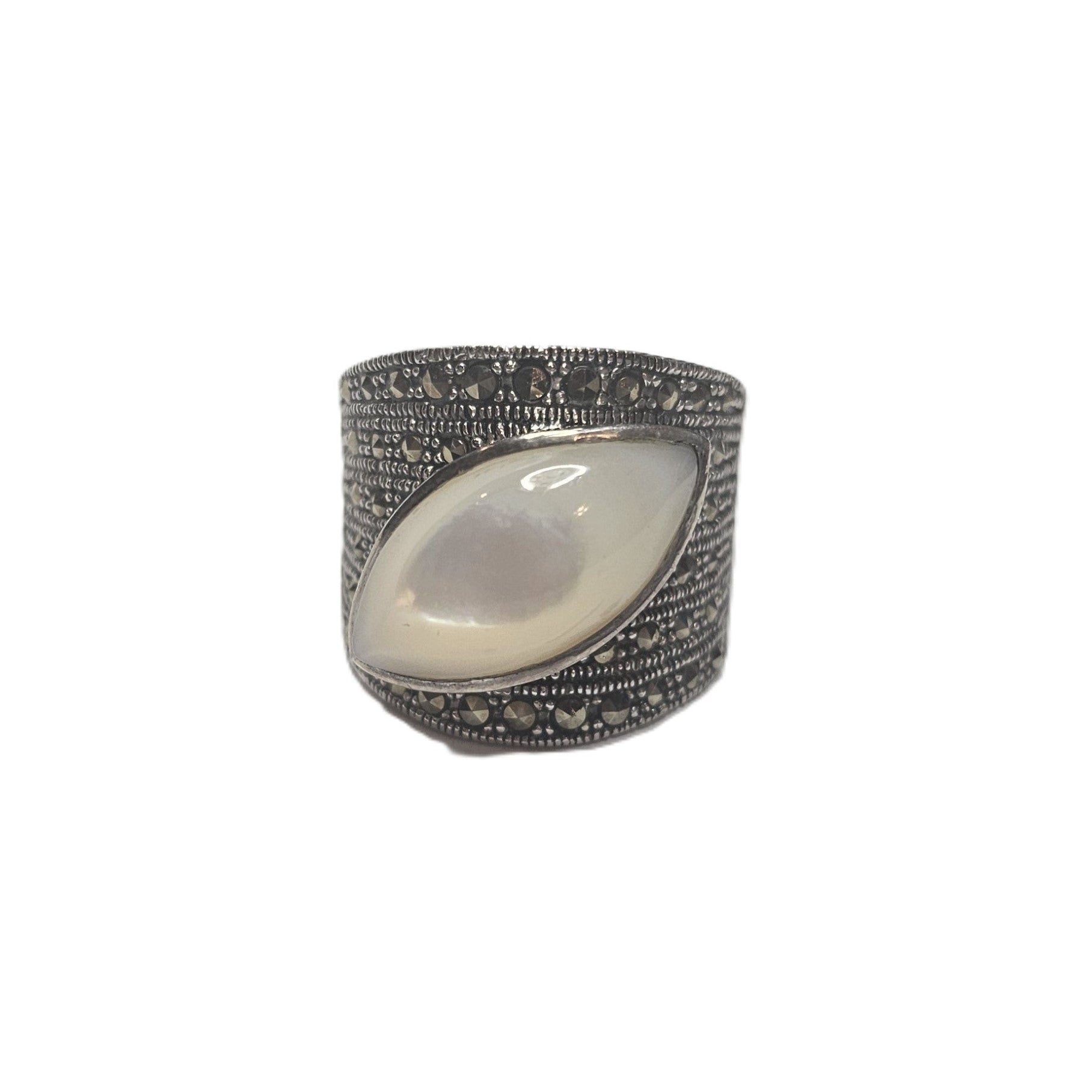 Mother of Pearl Shell and Marcasite Sterling Silver Band Statement Ring