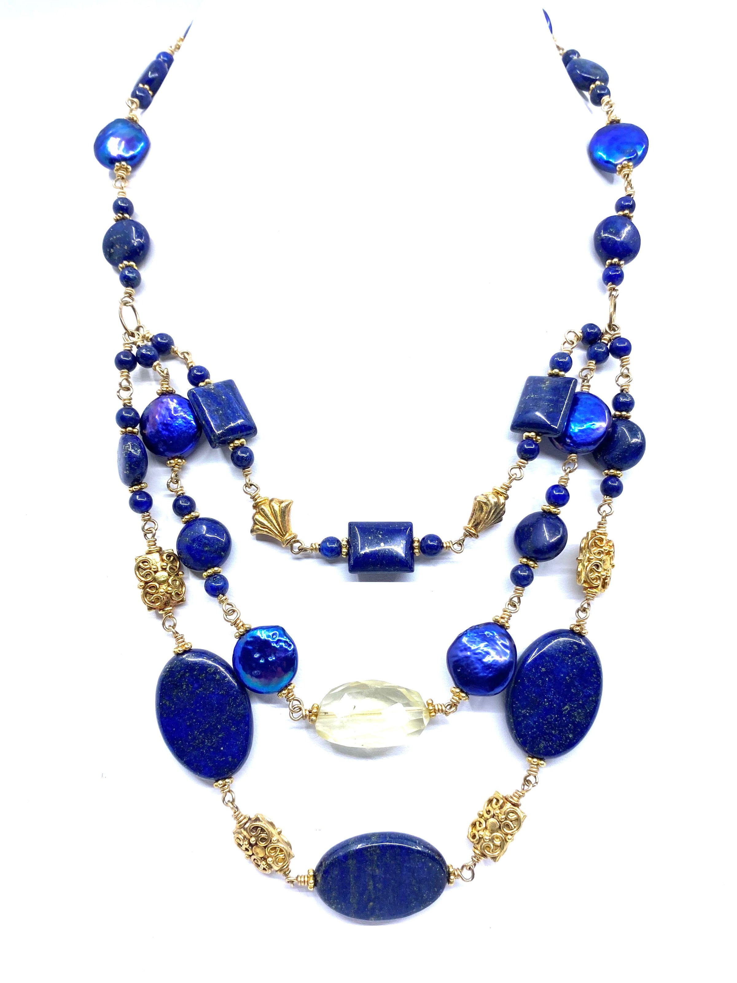 Stunning Lapis, Blue Coin Pearls, Lemon Quartz Layered Statement Necklace